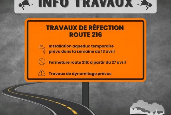 Saint-Elzéar – 14 mars 2026 TRAVAUX DE RÉFECTION – ROUTE 216 Dès la semaine du 13 avril, les résidences concernées recevront un avis concernant l’installation d’un aqueduc temporaire. Le début des travaux et la fermeture de la route 216 sont…
